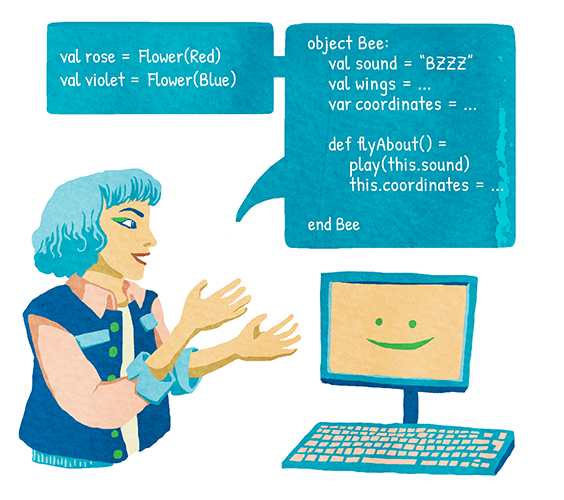 It’s possible to draw from several paradigms at once. The Scala language, for instance, has been deliberately designed to support and combine multiple approaches to programming. In O1, we’ll combine OOP first with what is known as imperative programming (imperatiivinen ohjelmointi) as well as functional programming (funktionaalinen ohjelmointi); the latter paradigm plays an increasingly prominent role in the second half of the course. No need to worry about that now, though — we’ll discuss paradigms in more detail in Chapter 11.2.