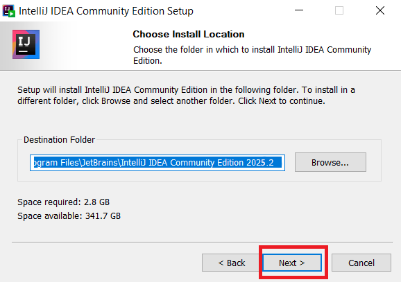Download IntelliJ IDEA Community, version 2025.2. Make sure to pick the Community edition, not the commercial Ultimate edition.